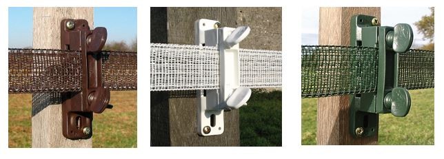 You can see the most common line insulator that our customers prefer for wooden posts in Image 1 above, the F8. These can be matched to the colour of the tape you have chosen. The F8 is secured to the wooden post with 2 screws (provided) that just need a cordless drill.