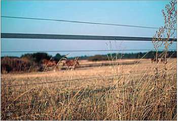 You will see only the two electric tapes, not the four strands of the barbed wire fence. Horses can't see small fencing material as well as they can see 40mm tape, making it more likely that a horse will sustain injury.