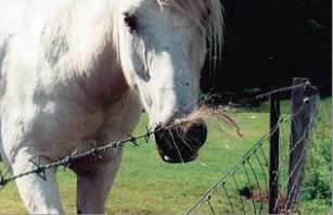 This barbed wire fence has been made far safer by the addition of two strands of StockGuard 30mm tape, increasing visibility and thus keeping the horses away from the fence. Jagged barbed wire causes perhaps the worst injuries to horses, and as barbed wire is often rusty, infection is another hazard.